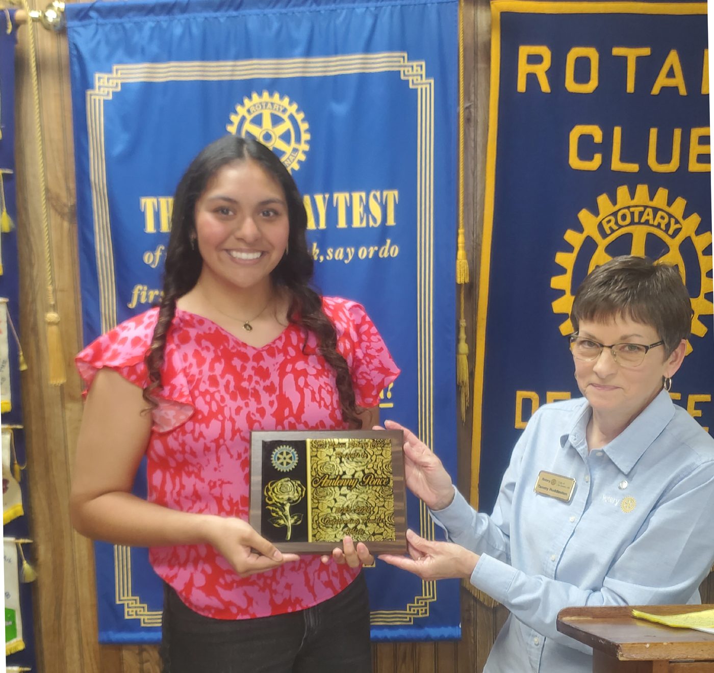 At Monday’s noon meeting of the club at Micah 6:8, Rotarian Tammy Huddleston presented the award for the 2025-2026 school year to Azulenny Ponce. Azulenny has earned Top Doubles, Top Singles, and the Lady Leopard Pride Award during her three-year tennis career at De Queen High School. She has competed in basketball for six years. As a member of the 2025 Lady Leopards state championship team, Azulenny was named the Most Improved Player. Ponce is also a four-year starting goalkeeper for the Lady Leopards soccer team, earning all-conference honors the past three seasons.