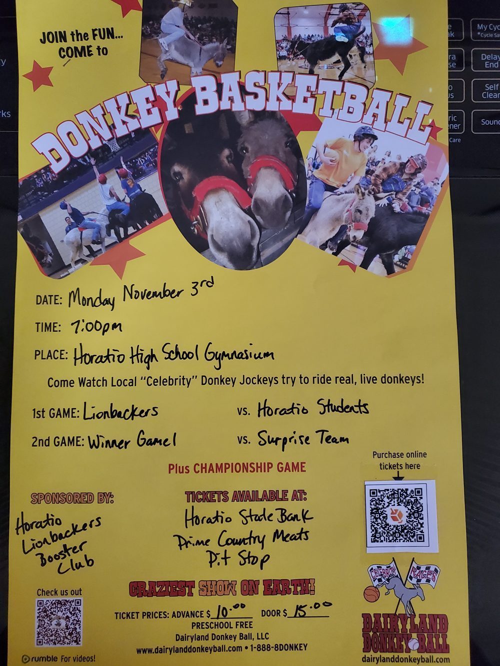 Horatio Lionbackers Booster Club will host Donkey Basketball on Monday, November 3rd, at 7 pm at the Horatio High School Gymnasium. Come watch local “Celebrity” Donkey Jockeys try to ride real, live donkeys. The first game will be Lionbackers vs Horatio Students. The 2nd game will be Winner of Game 1 vs Surprise Team. There will also be a championship game. Tickets are available at Horatio State Bank, Prime Country Meats, and Pit Stop. You can buy tickets in advance for $10, or tickets will cost $15 at door. Preschool is free. You can get more information by contacting Dairyland Donkey Ball, LLC at www.dairylandonkeyball.com or 1-888-8DONKEY.