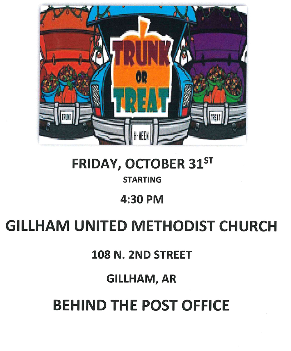 The Gillham United Methodist Church will host their Trunk or Treat on Friday, October 31st, starting at 4:30 pm. Address for the church is 108 N 2nd Street in Gillham, AR. The church is located behind the post office.