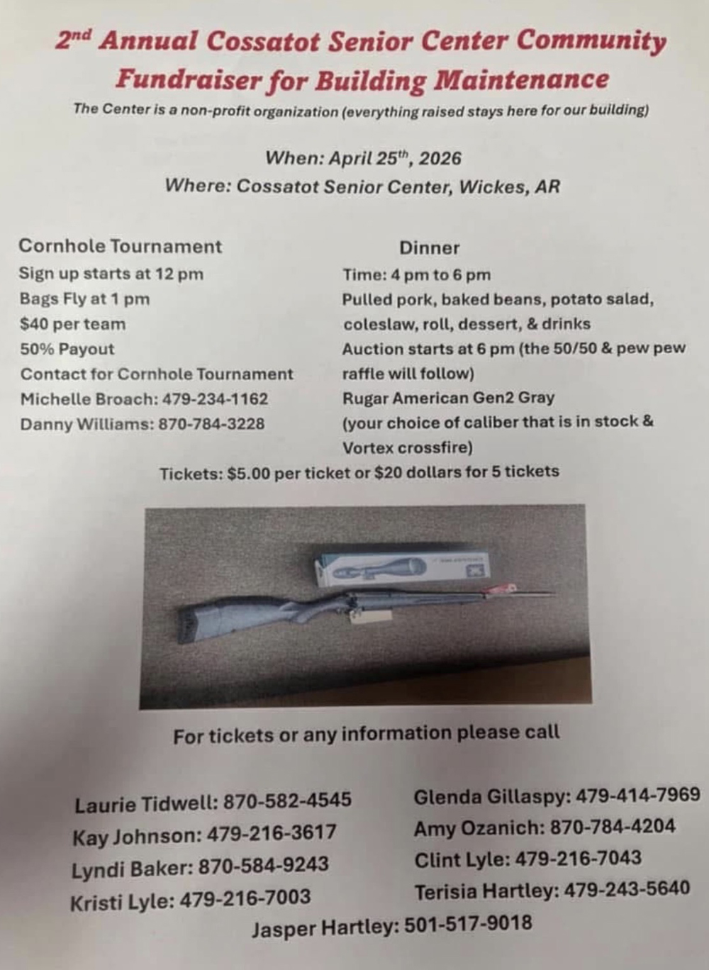The 2nd Annual Cossatot Senior Center Community Fundraiser for Building Maintenance will be held on Saturday, April 25th, at the Cossatot Senior Center in Wickes, AR. There will be a cornhole tournament where signup begins at 12 pm and bags fly at 1 pm. It costs $40 per team with a 50% payout. You can contact Michelle Broach at 479-234-1162 or Danny Williams at 870-784-3228. Dinner will take place from 4-6 pm and consists of pulled pork, baked beans, potato salad, coleslaw, roll, dessert, and drinks. Auction will start at 6 pm (50/50 and pew pew raffle will follow). The raffle is for a Rugar American Gen2 Gray or your choice or caliber that is in stock and Vortex crossfire. Tickers are $5 per ticket or $20 for 5 tickets. For tickets or any information, please call Laurie Tidwell (870-582-4545), Kay Johnson (479-216-3617), Lyndi Baker (870-584-9243), Kristi Lyle (479-216-7003), Glenda Gillaspy (479-414-7969), Amy Ozanich (870-784-4204), Clint Lyle (479-216-7043), Terisia Hartley (479-243-5640), or Jasper Hartley (501-517-9018).