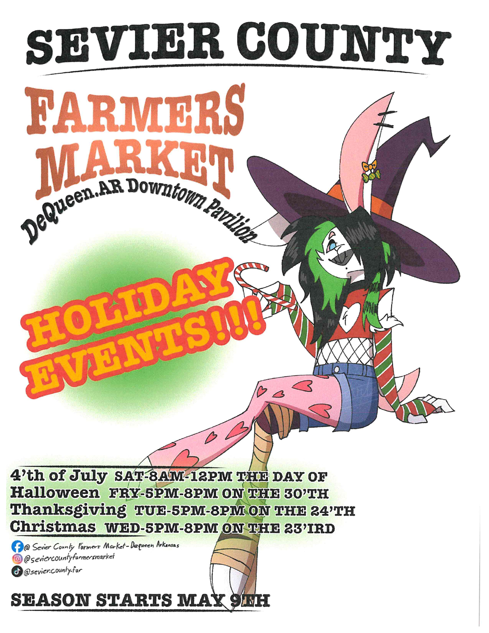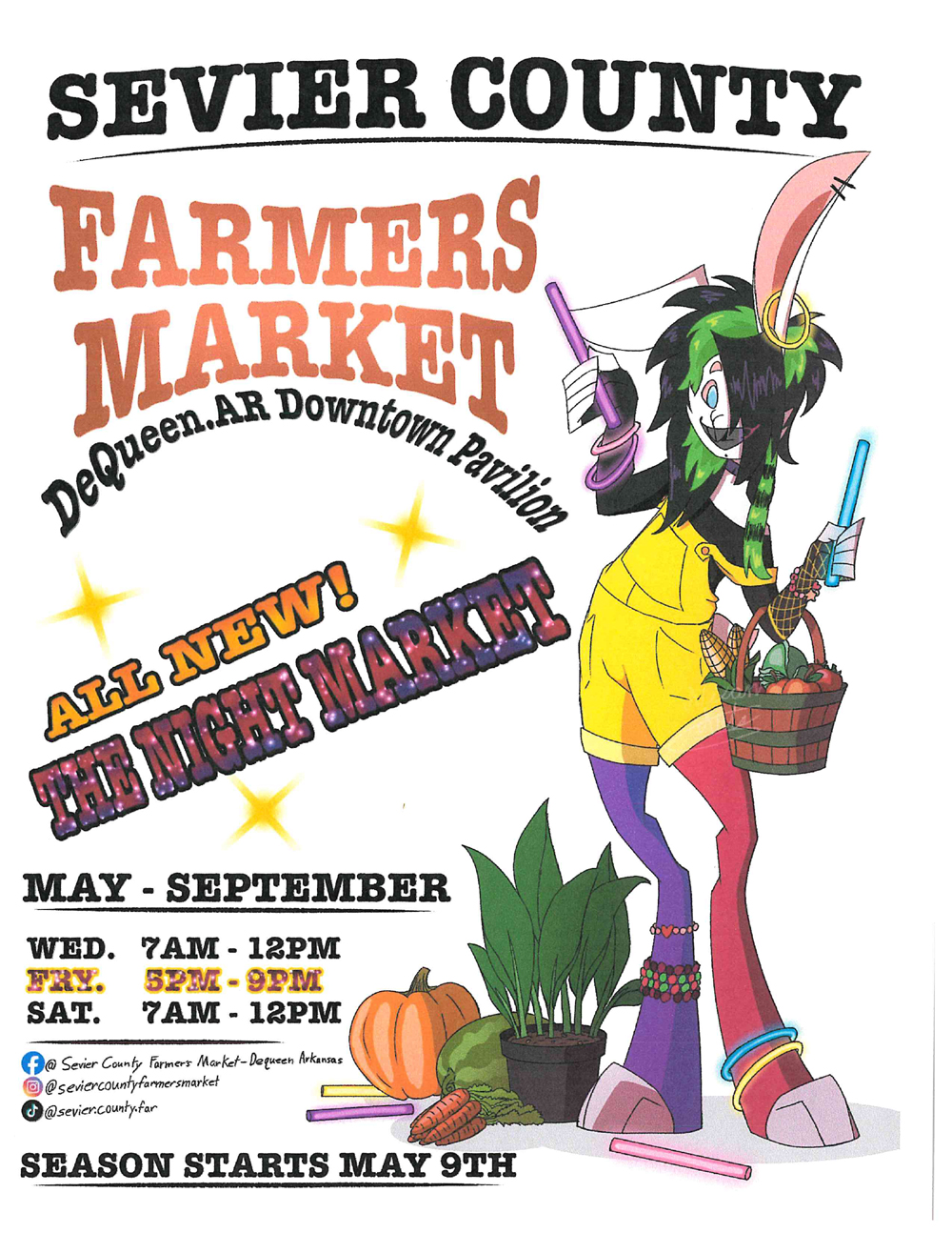 The Sevier County Farmers Market is back at the Downtown Pavilion in De Queen and taking place beginning on Saturday, May 9th, through month of September on Wednesdays, from 7 am-12 pm, Fridays from 5-9 pm, and Saturdays from 7 am-12 pm. The Farmers Market will host holiday events on July 4th, from 8 am-12 pm, Halloween on Friday, October 30th, from 5-8 pm, Thanksgiving on Tuesdays, November 24th, from 5-8 pm, and Christmas on Wednesday, December 23rd, from 5-8 pm.