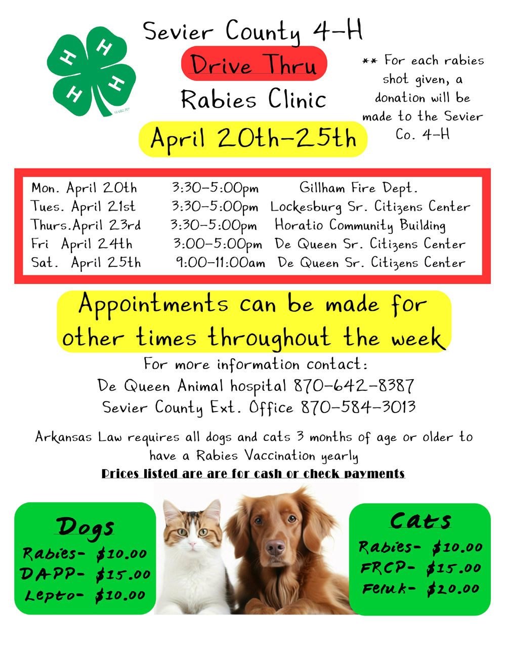 The Sevier County 4-H is hosting a Drive Thru Rabies Clinic on Friday, April 24th, from 3-5 pm at the De Queen Senior Citizens Center and Saturday, April 25th, from 9-11 am at the De Queen Senior Citizens Center. For Friday and Saturday, please enter on Haes Ave from N Lakeside Dr by the Co-op Filling station and exit on N Maple St. If it’s raining 4-H will drive under the awning to do vaccines. Appointments can be made for other times throughout the week. Shots for dogs are as follows: $10 for rabies, $15 for DAPP, and Lepto for $10. Shots for cats are as follows: $10 for rabies, $15 for FRCP, and $20 for Feruk. These prices are for cash or check payments. Arkansas Law requires all dogs and cats 3 months of age or older to have a rabies vaccination yearly. For more information, contact the De Queen Animal Hospital at 870-642-8387 or the Sevier County Extension Office at 870-581-3013.